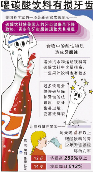周主任说,虽然不少家长都知道糖吃多了对牙齿不好,但对碳酸饮料的危害却了解甚少,认为饮料很快就喝进肚子里了,对牙齿应该不会造成影响,因而对孩子的滥喝饮料不加控制。可实际上,碳酸饮料对牙齿有双重损害——碳酸饮料中既有大量糖分又含有有机酸性,饮料中的糖分与牙菌斑接触会发生酸性反应,侵蚀牙釉质,使牙齿矿物质被溶解,软化牙齿,容易产生龋齿。而饮料中的有机酸则可直接分解牙齿的钙质,造成牙齿脱钙,产生龋洞。因此,要尽量少喝这类饮料,如果确实喜欢喝,可以用吸管吸,以减少饮料和牙齿接触的时间,喝完之后立即用清水漱口。