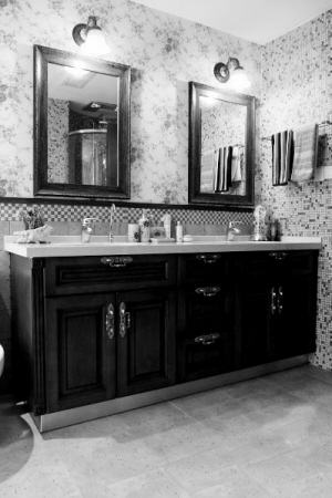 浴室里零碎却又常用的小物件众多,并且材质各异造型百态,如果不重视收纳,不管卫生间面积大小,一样杂乱不堪。所以,浴室收纳非常重要。卫生间的面积需要充分利用,所以,即便是一些犄角处也不能轻易放过。“扁身材”的毛巾架能灵活适用于卫浴间的夹缝之中,多杠杆的设计一次性可放置四至五块毛巾。卫浴空间普遍存在潮湿的问题,细长型的木质柜体搭配透明门板可以让收纳物品及属性一目了然,其中防水板材的设计利用则能有效地将卫浴空间的湿气排除在外,使电吹风、卷发棒等电器产品能安心收纳。