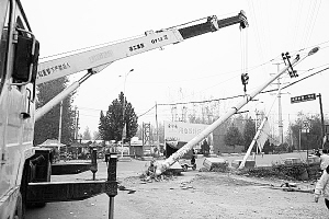 事故发生后,周口供电公司和市公安局有关人员第一时间到达现场,对现场进行清查,并对此路段交通进行管控,防止超高车辆碰触电线。经过施工人员的紧张工作(如图二),18时许,受损区域恢复供电。通讯员 魏可 摄