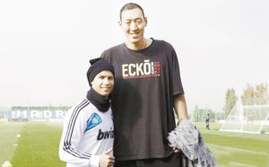 西班牙当地时间2012年10月22日,2米36的中国篮球运动员孙明明造访皇马,与C罗、卡卡亲密合影。
