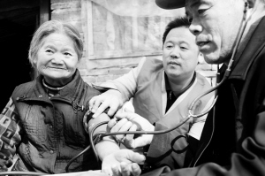 图二:“义工儿女”在为空巢老人张秀芝(左)测量血压。