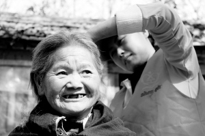 图一:“义工儿女”李丽在为空巢老人张秀芝(左)剪头发。