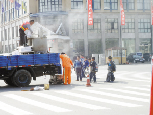昨日,记者看到,施工人员正在周口市区五一路与莲花大道交叉口紧张忙碌——设置斑马线。据了解,这两天施工人员将会给整条五一路设置标志线。