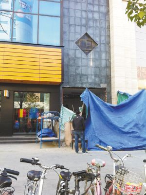 当天下午,记者来到中州大道与七一路交叉口赵先生所说地点,在两家商铺之间,施工现场被人用蓝色塑料布遮挡,透过塑料布可以看到新改建的“门面房”(如图)。据了解,改成“门面房”的房子属于中国人民银行周口支行办公楼中的一间,施工人员将一扇后窗改成了门。