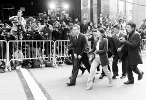 10月25日,韩国总统李明博长子李时炯(前排右二)前往韩国特别检察官小组所在地接受调查。