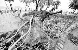 三亚湾一棵大树被连根拔起(10月28日摄)。
