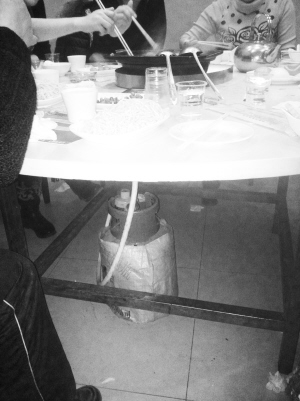 记者在市区汉阳路一家火锅店看到,虽然同样使用的是液化气,与路边摊不同的是,这里的一个液化气罐只供一台液化气灶使用,放在餐桌的下方,由工作人员负责开关。