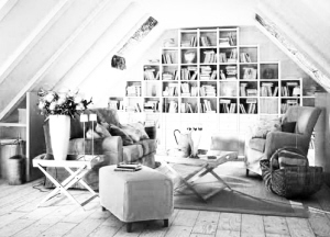 阁楼的边角由于往往不太规整,所以常常会形成设计上的死角。这间用阁楼打造的起居室里,靠墙的角落利用两边的斜顶因势利导打造出一整面橱架,将阁楼上半部的畸零空间也完美利用了起来。橱架上部为开放式书柜,方便搜索书刊,下半部分为抽屉式,可以分类存放票据之类的小件杂物。