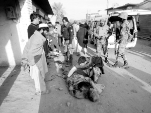 12月10日,巴基斯坦士兵和居民在西北部本努特区的自杀式袭击现场围观。