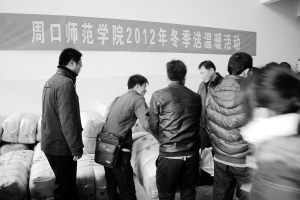 为帮助贫困学生度过寒冬,12月13日,周口师范学院学生资助中心工作人员与各院系辅导员一起,向1000余名贫困学生发放爱心棉被,使冬日的校园处处涌动着爱的暖流。周宣 摄