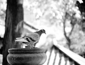 一只斑鸠谨慎地站在窗台,沐浴着如花怒放的阳光,歪着小脑袋往屋里看。天地瞬间祥和明亮。它很漂亮,纺锤形的身体,流畅的线条,发散灰蓝色亮闪闪的光。脖子杂了圈白色的羽毛,像戴个美丽的项圈。