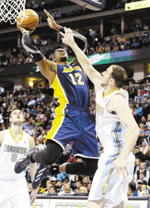 当日,在2012-2013赛季NBA常规赛中,洛杉矶湖人队客场以114比126不敌丹佛掘金队。新华社/路透