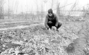 菜农康大婶正忙着用塑料布把一些长势较好的蔬菜盖起来,以防受冻。“我们家的菜地面积不大,就没有使用塑料大棚。如果不用塑料布把这些蔬菜盖起来,很快它们就会冻死。”康大婶说,“看看这些黑白菜,没照料好,大部分都给冻死了。”