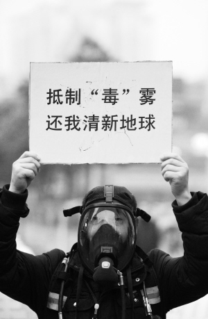 1月16日,志愿者在街头以行为艺术的方式号召人们保护环境、绿色出行。
