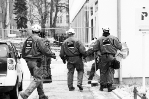 1月15日,在德国柏林市西南部施泰格利茨区,安保人员在发生盗窃案的银行后院清理物品。