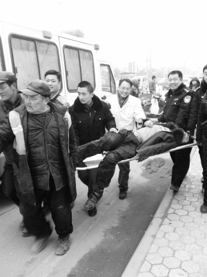 1月22日下午4时许,一男子醉酒后昏倒在交通大道东段文昌办事处附近的公路边,附近几位好心市民以及两位清洁工见状,迅速拨打求救电话。为防止意外事故发生,这些好心人一直守候在醉酒男子身边。120救护车赶到后,他们又帮助医护人员将醉酒男子抬到救护车上送往医院救治。记者 高洪驰 摄