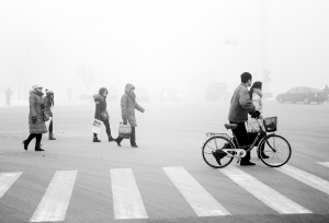 1月22日,石家庄市民穿过塔北路与谈固南大街十字路口。