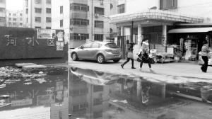 当日14时许,记者在颍河小区门口看到,浑浊的污水从一个窨井里汩汩冒出,积聚在小区门口(如图),从小区出来的居民大多捂着鼻子。记者注意到,污水缓慢流向道路一侧的下水道。“还好有个下水道,要不然小区门口早成河了。”颍河小区居民郑女士说。