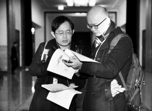 3月10日,十二届全国人大一次会议在北京人民大会堂举行第三次全体会议。这是两名记者拿到“两高”工作报告后立即阅读。新华社发