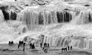 3月18日,游客在山西吉县欣赏黄河壶口瀑布“桃花汛”。