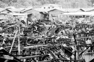 3月28日,在马来西亚沙巴州首府哥打基纳巴卢,火灾后的水上木屋区一片狼藉。