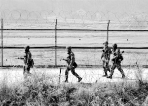 3月27日,韩国边境城市坡州,韩国士兵沿着铁丝网巡逻。