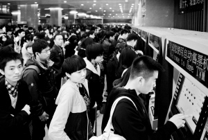 上图:4月3日,在天津火车站,旅客在自动售票机前排队买票、取票。