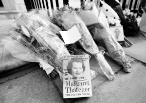当地时间4月8日,在英国伦敦,人们悼念英国前首相撒切尔夫人的鲜花和书籍等放置在她的住所前。