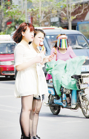 4月15日15时许,记者在市区七一中路与五一路附近看到,市民纷纷穿上了明亮的春装,一些市民还戴上了遮阳帽,甚至一些年轻人早早穿上了裙子和短袖衫,还不忘买上一支雪糕降温。