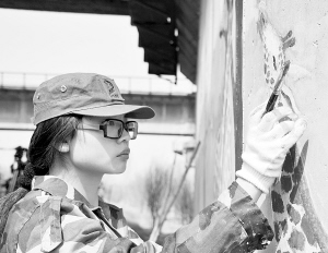 4月15日,“树洞妹妹”王月以桥墩为画布创作表现生态和谐的作品。