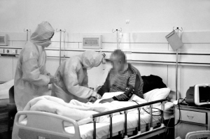 4月14日,我市综合判定1例人感染H7N9禽流感确诊病例,目前患者张某某在医院的全力救治下,病情持续好转。这是医护人员在对该患者进行检查。