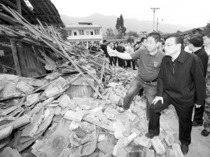 4月20日,中共中央政治局常委、国务院总理李克强抵达四川芦山地震灾区察看灾情,部署抗震救灾工作。这是李克强在受灾严重的双石镇察看灾情。 新华社记者 黄敬文 摄