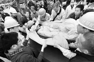 4月21日,救援人员在宝兴县灵关镇将一名伤者抬出废墟。