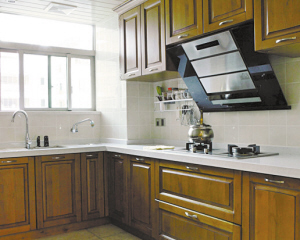 厨房 设计比较简单,一套乡村风格的原木橱柜就凸显田园生活的悠闲(图④)。