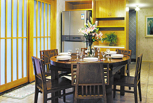餐厅 与客厅连贯,只是在天花上作些区隔而已,总体延续了客厅的设计特点,重点放在通往厨房的趟门造型,采用“线”的手法,突出东方地域的特征,设计亮点是将储物间门和小视听室门处理成二道实木线条装饰面,将门隐藏于其中,没有门的形状,只有排列整齐的线条(图②)。