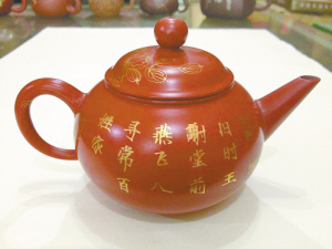 描金工艺,则是借鉴了漆器的装饰手法,在烧制好的壶上,用金粉或金水描出图案。“纯金不会褪色,我这把描金壶用了20多年,金色还和当初一样光鲜。”王志中说。