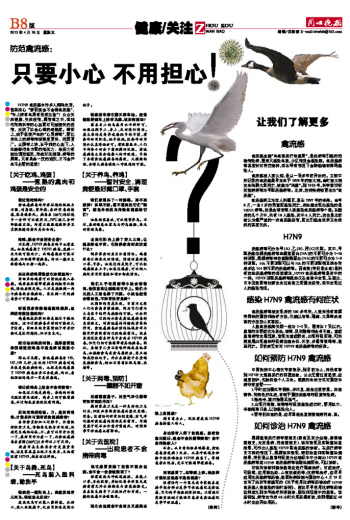 H7N9禽流感令许多人闻鸡色变,甚至担心“穿羽绒会不会得禽流感”、“车上掉有鸟屎有没有危险”!公众关注健康、关注疫情,属情理之中,但如何保持科学的心态面对可能袭来的疫情,反映了社会心理的成熟度。事实上,由于恐慌产生的“心灵病毒”,要比身体上的病毒传播速度更快、范围更广。从医学上讲,在平和的心态下,人体能够把各方面的抵抗力、免疫力有效地调动起来,形成对抗细菌、病毒的屏障。只有具备一定的知识,才不会产生不必要的恐慌!