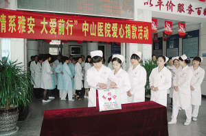 一方有难,八方支援。四川雅安地震牵动着全国各族人民的心。4月27日下午,周口中山医院举行了“情系雅安 大爱同行”爱心捐款活动,该院医护人员为灾区默哀3分钟后,齐声高呼“雅安加油,我们同行”,他们纷纷伸出援手为灾区献上一份爱心。活动共计捐款6800元,图为捐款现场。(刘艳霞 摄)