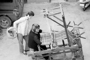 张桂花13岁时就学会了纺花、纺线、织布。“先将棉花弹好,用筷子将棉花卷成筒,再支上纺车开始纺线。纺好线后,再经线、浆线、染线,然后再将纺线架到织布机上织布,光织布就得1个月左右。纺花、纺线、织布、做衣服一套下来需要两个月。一家大大小小七八口人,衣服、床上用品都是我一个人做的。”张桂花自豪地说。