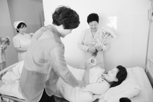 5月12日母亲节当天,周口妇产医院联合市妇联举办多种活动,慰问周口市区贫困家庭的母亲,并为全院女职工每人送上一支康乃馨,以表达该院对女职工的关心。图为院长张平慰问刚在该院生下宝宝的年轻母亲。