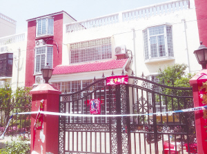 记者走进案发现场,发现前一日警方设置的一道和二道警戒线已经拆除,只在案发楼房的门口还设着一道警戒线(如图)。