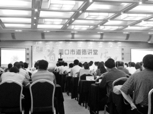 5月14日上午,由市文明办主办的周口道德讲堂在周口饭店开讲,本期活动承办单位是市质量技术监督局。图为周口职业技术学院刘冬梅老师向与会人员讲授礼仪知识。晚报记者 宋风 摄