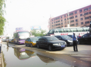 昨天早上8时许,记者来到现场,看到“顶牛”的5辆车仍停在路上:一辆在周口市区和沈丘运行的客车被两辆出租车前后“夹击”,两辆私家车又前后堵住出租车,造成双向4个车道的路面被占去近2个车道的宽度。由于正值上班时间,再加上路旁就是周口汽车东站,车流量较大,尽管现场有交警执勤,仍出现了比较严重的交通堵塞。