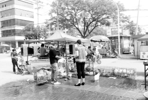 当日上午,记者在市区工农路看到,消失了一段时间的活鸡摊位又出现在路边。不少市民从摊位前路过时,都会忍不住看一下,个别市民还走过去购买活鸡(如图)。