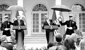 5月16日,奥巴马和到访的土耳其总理埃尔多安在白宫玫瑰花园举行联合新闻发布会,其间下起了雨。奥巴马当即叫两名海军陆战队士兵过来打伞,此举招致了外界一片非议。