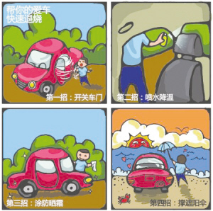车主在停车时不仅要考虑交通方便等问题,还要考虑到尽量防止车辆在烈日里暴晒的问题,尽量把车停放在阴凉通风处。同时,在夏天洗车时,可以常常清洗一下水箱,可去除附着在上面的杂物,这样发动机更容易散热。专家建议,给爱车准备一把防护伞遮阳板,是一种不错的选择。