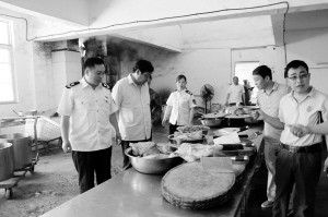 5月21日至24日,市食品安全办组织我市教育、工商、质监、食药监督、卫生等部门工作人员,分成5个督查组分赴全市各县市区各级校园,对学校食品及公共卫生安全专项检查开展情况进行督察。图为督查组在郸城某中学检查食堂卫生情况。