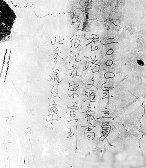 5月26日,网友“白兆东”转发了一条微博:“在甘肃敦煌壁画上竟然有《文汇报》高级记者宋寅的留言:二零零零年立夏,香港文汇报高级记者宋寅到此参观考察。”记者看到,宋寅的留言是用黑色笔写的,其中有4个字是繁体字。在宋寅留言的旁边,还有一些字迹模糊的小字,已经看不清,似乎被人擦过(如图)。