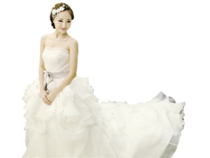 Vera Wang款 这是美国华裔著名婚纱设计师的婚纱作品,款式简洁、大方,面料舒适,不规则的裙摆由台湾纱和褶皱纱组成,腰间银色蝴蝶结为点睛之笔。