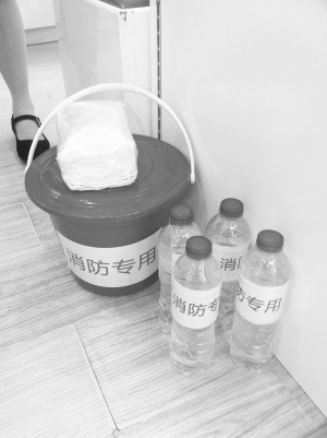 6月20日,记者在周口市区七一中路一家大型商场看到,该商场除了按规定配备各种消防设备外,还在几百个柜台里准备了装满水的水桶和矿泉水瓶。